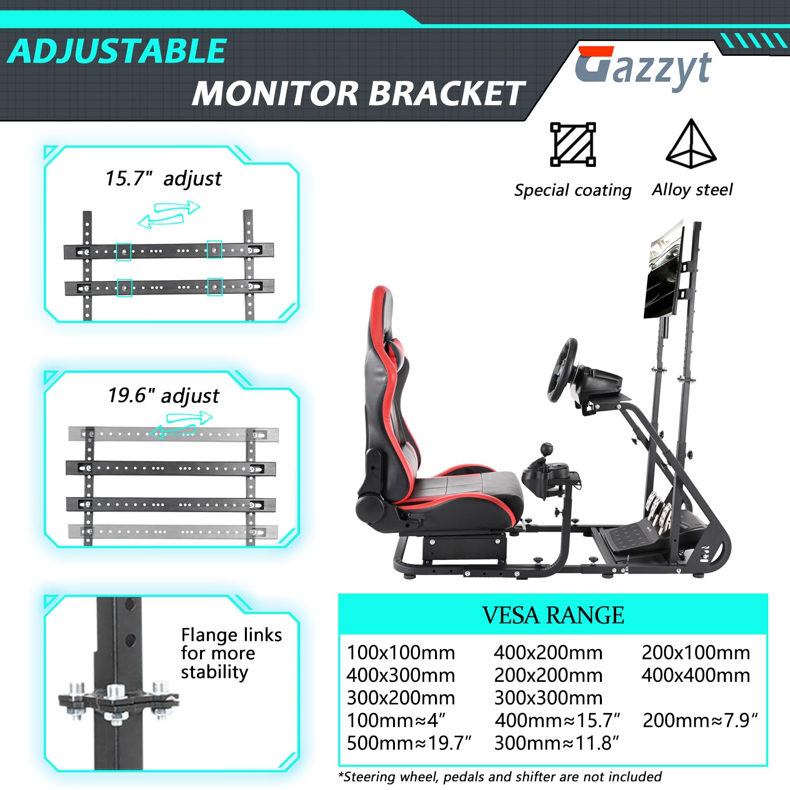 - Características: esta cabina de simulador de carreras tiene una nueva actualización del soporte regular, con un soporte de monitor de montaje de tubo cuadrado sobre el soporte y un soporte de monitor para montaje en TV. Te permite tener una experiencia de juego perfecta.