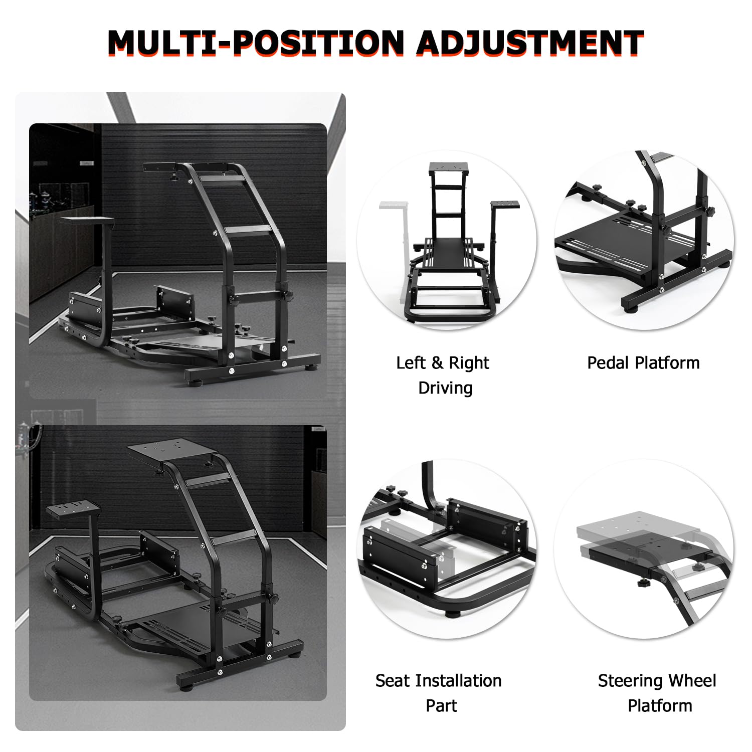 - Ajuste completo: la altura del soporte del simulador de carreras se puede ajustar, el ángulo de los pedales también se puede ajustar automáticamente y la parte del soporte de palanca de cambios también se puede instalar a izquierda y derecha para ajustar de acuerdo a los hábitos personales, adecuado para personas de diferentes alturas y pesos.