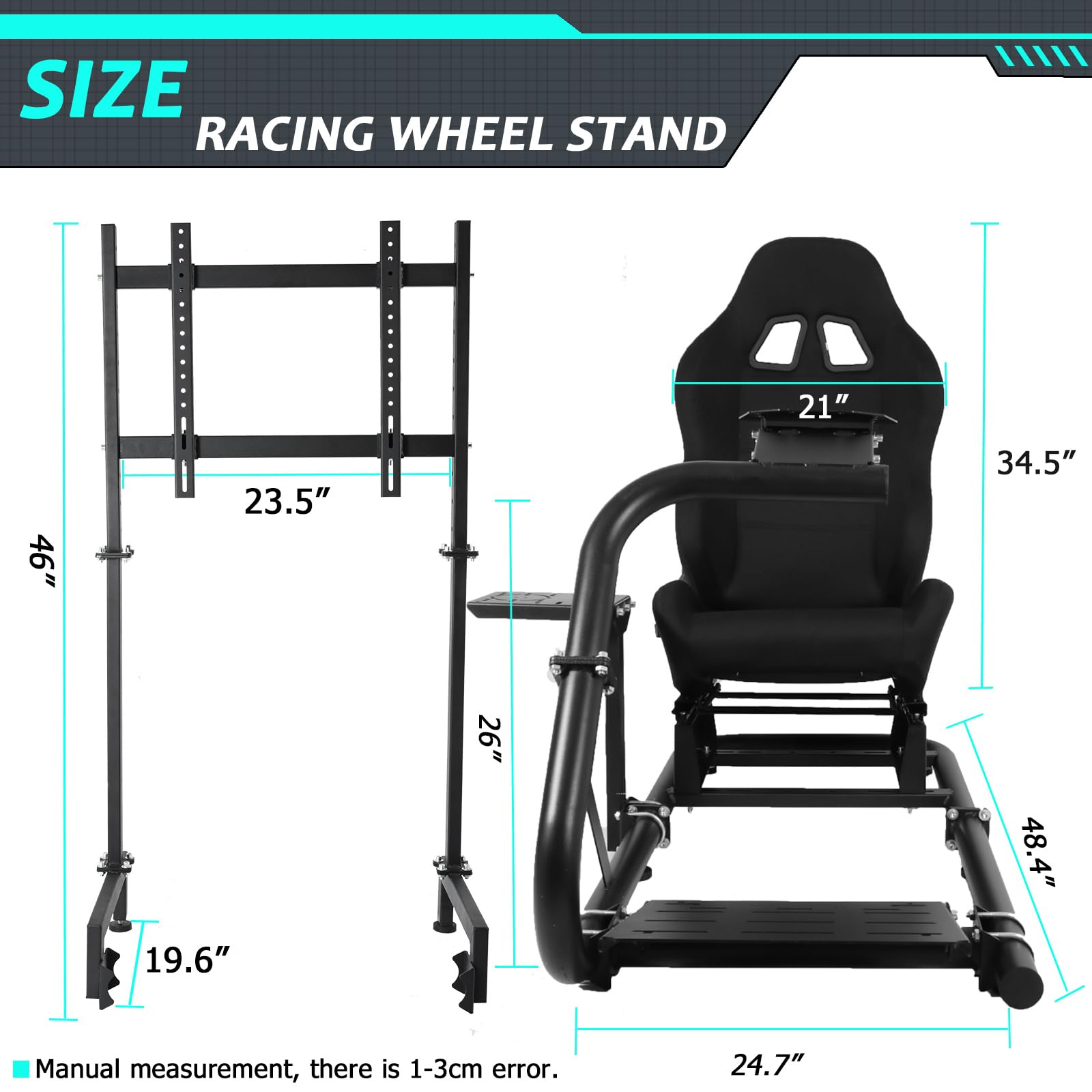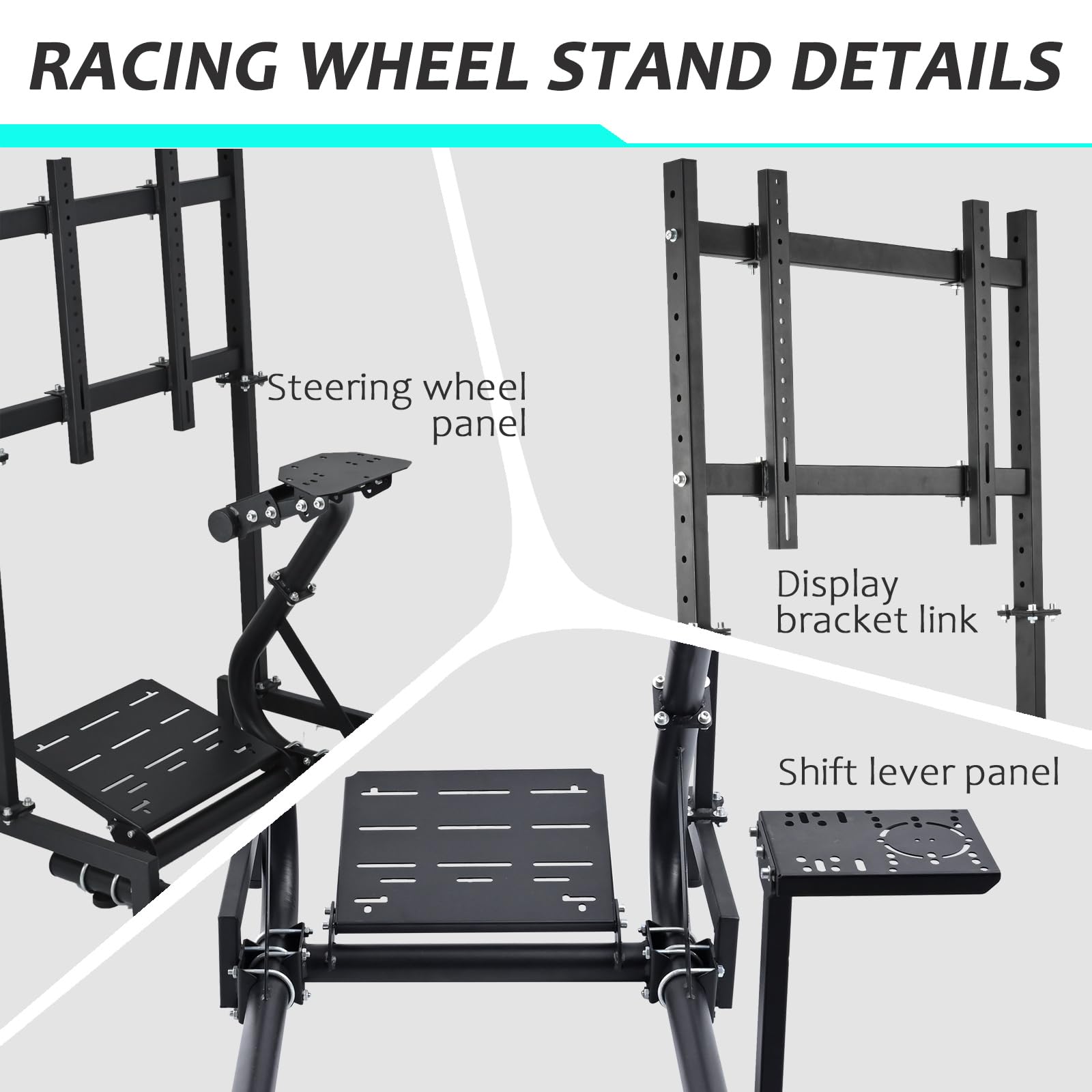 - Soporte para monitor: este soporte para monitor se puede instalar con diferentes tamaños de monitores de 17 a 60 pulgadas, el soporte se puede ajustar de acuerdo con el tamaño del monitor, lo que te da una experiencia completa todo en uno. También se compone de tubos cuadrados de 0.984 in y 1.575 in, que son más estables cuando se utilizan para la simulación de juegos y reducen el temblor cuando se usa.