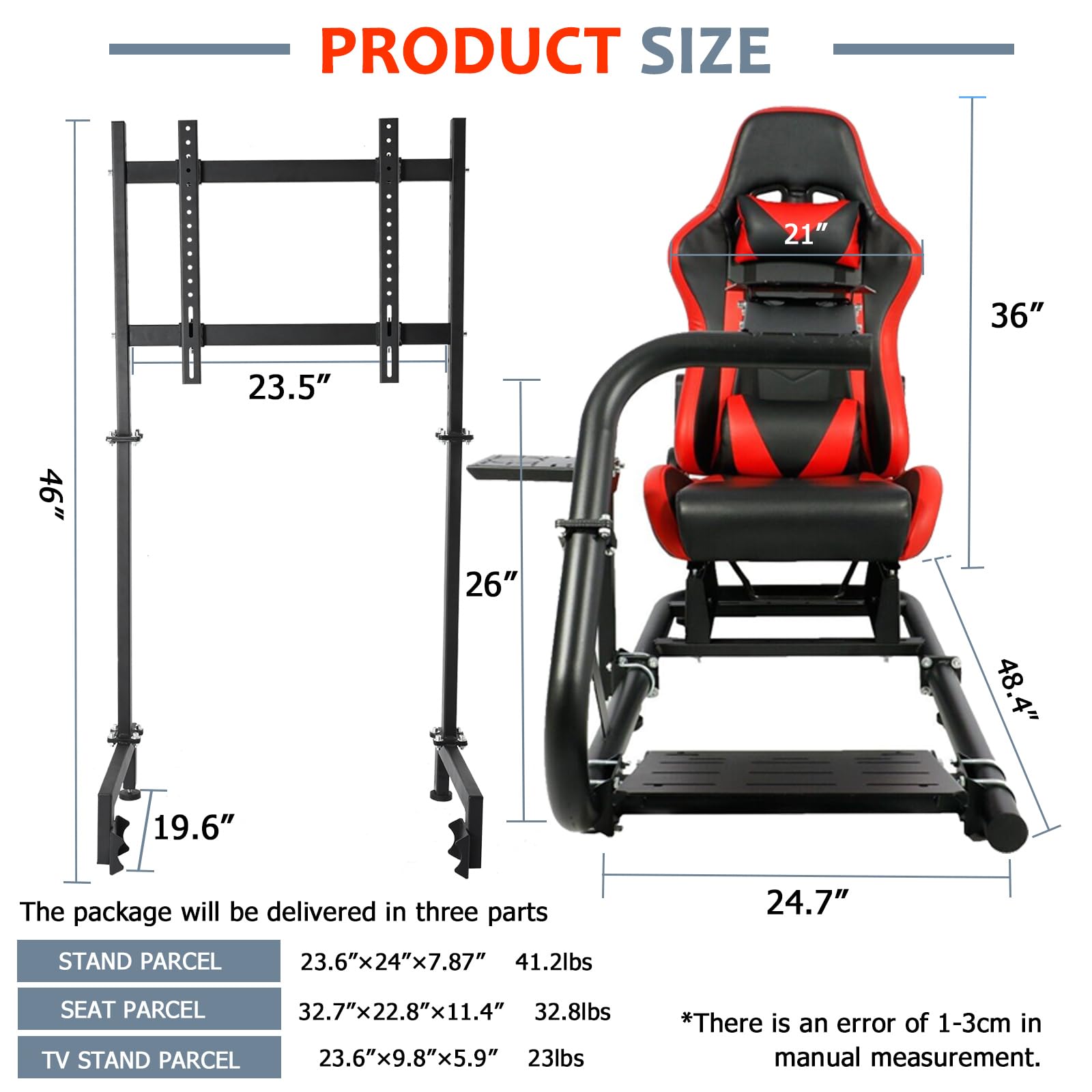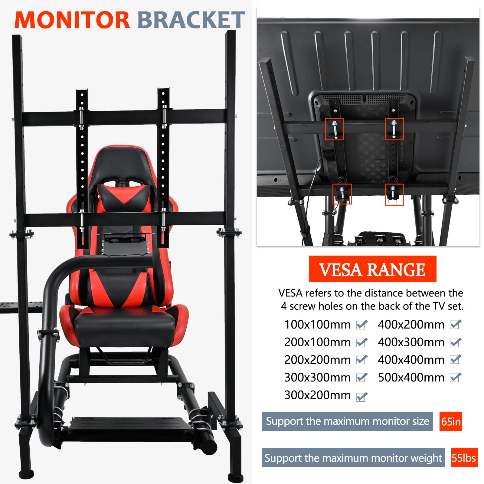 - Soporte para monitor: este soporte para monitor se puede instalar con diferentes tamaños de monitores de 17 a 60 pulgadas, el soporte se puede ajustar de acuerdo con el tamaño del monitor, lo que te da una experiencia completa todo en uno. También se compone de tubos cuadrados de 0.984 in y 1.575 in, que son más estables cuando se utilizan para la simulación de juegos y reducen el temblor cuando se usa.
